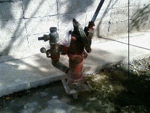 井戸は土地を契約する前に試掘させてもらった(\3,000)。水は一番大切なので、水が出なかったり飲める代物で無い場合は契約しないという条件だ。幸い4.5mほどできれいな水が出た。飲んでもとてもおいしい水だ。写真は手動ポンプ(\5,600)を取り付けたもの。このポンプは優れもので水を高所に送ることができる。将来は電動ポンプを取り付けてオーバーヘッドタンクに送るつもりだ。圧力タンクではなくオーバーヘッドタンクを採用する理由はこちらの電源事情はとても悪くたびたび停電する。停電してもタンクに水がある間は使えるからだ。またソーラー温水器を設置した場合のタンクにもなるだろう。 |