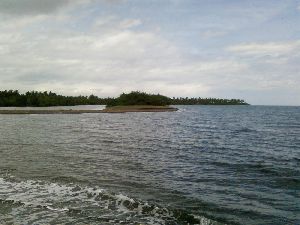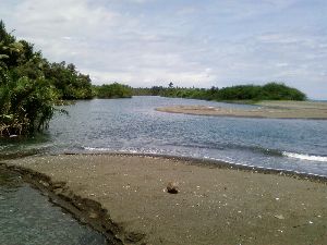 満潮に近いときの河口の写真(左側は川)。右側は海。先日右奥の海をもぐってみたら、死んでしまったサンゴがたくさんあった。15年ぐらい前はとてもきれいなダイビングスポットだったと思う。フィリピンの有名なボラカイ島も今は珊瑚が死んでしまい、昔の面影は無い。 |