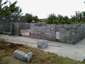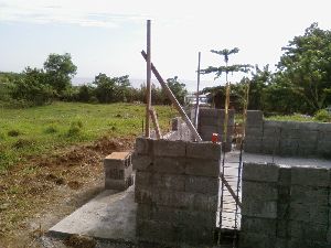 床は最後にコンクリートを打つようだが、足場が悪いのは気持ち悪いので、最初に床を作って壁作りに入った。壁はブロックを積んで作る。ブロック一個12円。日本の10分の1ぐらいだが、品質も10分の1だ。強度はまったく無く、中に充填するコンクリートと鉄筋で持たせるようだ。外形寸法もまちまち