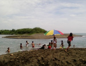 海はまあまあきれいだが、川は汚れている。現地の子供たちはそれでも平気で泳いでいる。満潮時には川を逆流して海の水が流れ込むので、少しはきれいに見える。 |