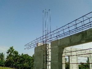 一階の柱と梁が出来上がった状態。これからスラブを打つのだが、一回では無理なので3回に分けた。ヘルパーも数人が必要だ。コンクリートミキサーも無いので手こねだ。二人はコンクリート作り、もう二人は運搬、そして私は型枠の中に流し込み同時に水平にならさなければ。硬く強いコンクリートにするため砂利と砂とセメント比は2:2:1にし 、水セメント比は0.6に設定したが、とても硬くて流れていかない。 バイブレータも無いので流れるようになるまで水を足した。 強度が心配だが.... |