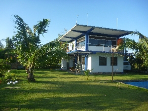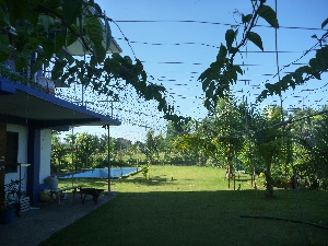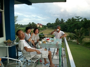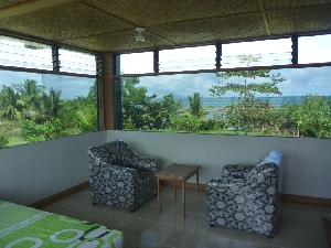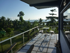 二階のテラスから見る風景。向こうは海です。 コーヒーを飲みながら日の出を見る、ビールを飲みながら夕涼みをする等、一日の大半をここで過ごします。一番気に入っているところです。 |