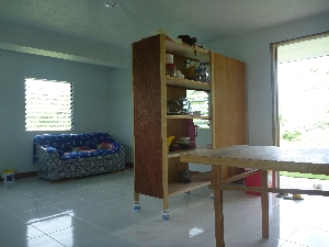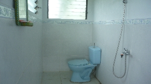 トイレは1階と2階にあり、ウォッシュレットです。水は井戸を掘り確保しました。電気はソーラー発電でライト、冷蔵庫、ファン、パソコン、テレビが使用できます。 |